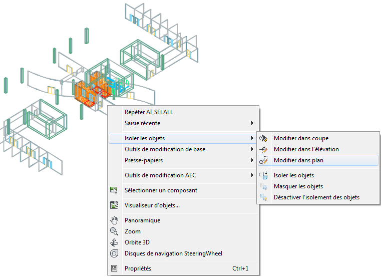 Vous pouvez spécifier une sélection d'objets dans un dessin et les afficher, pour éventuellement les modifier, dans une vue temporaire de type coupe, élévation ou plan. Le SCU s'aligne automatiquement sur la vue temporaire au cours de la modification.