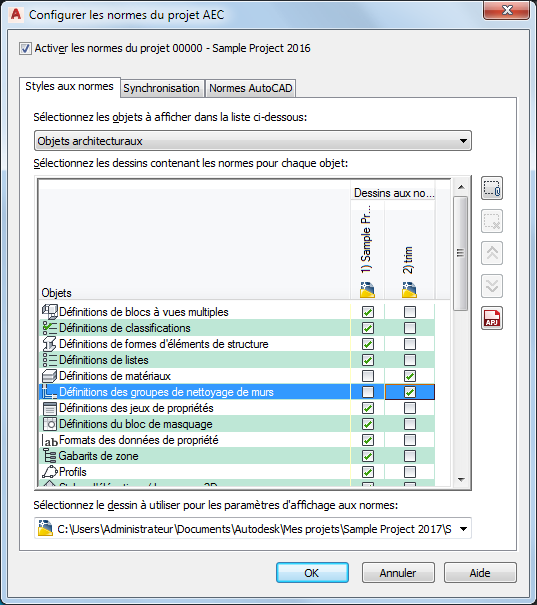 Lors de cette opération, les styles et les paramètres d'affichage du projet ou du dessin de projet sont comparés aux normes du projet afin de vérifier s'il existe des incohérences entre les versions et de les corriger, le cas échéant.