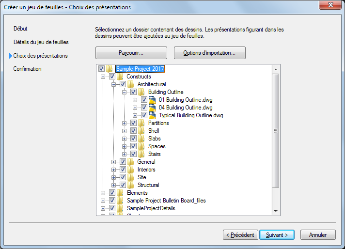 Dans la boîte de dialogue Créer un jeu de feuilles - Choix des présentations, vous pouvez sélectionner des présentations dans des dessins existants et les ajouter au gabarit de jeu de feuilles sous forme de feuilles. Cela vous permet, par exemple, de convertir des feuilles héritées en feuilles de projet.