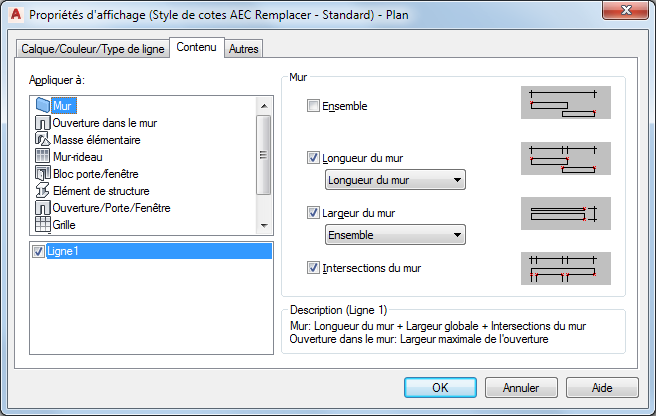 Exemple : sur la première ligne, vous voulez coter la longueur et les intersections de murs. Dans le champ Appliquer à, sélectionnez Mur.