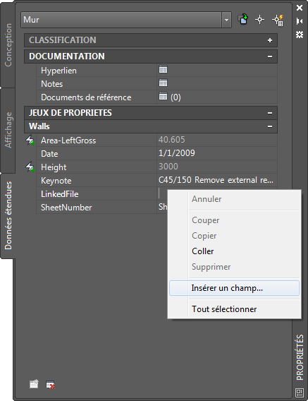 Pour ajouter un champ aux propriétés d'un objet donné, il suffit de créer une propriété manuelle sous forme de marque de réservation du champ. Celle-ci sera résolue en temps utile. Cette opération est particulièrement utile si vous souhaitez ajouter des informations différentes selon l'objet et nécessitant des mises à jour régulières.