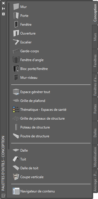 Les palettes d'outils constituent le principal moyen d'accès aux outils de création d'objets dans le modèle. Elles offrent des outils pour des objets standard, ainsi que pour des objets possédant des styles et des propriétés spécifiques. Les palettes d'outils sont organisées en groupes de palettes d'outils dans un jeu de palettes d'outils. Vous pouvez créer vos propres palettes d'outils ou copier des palettes d'outils existantes à partir du Navigateur de contenu.
