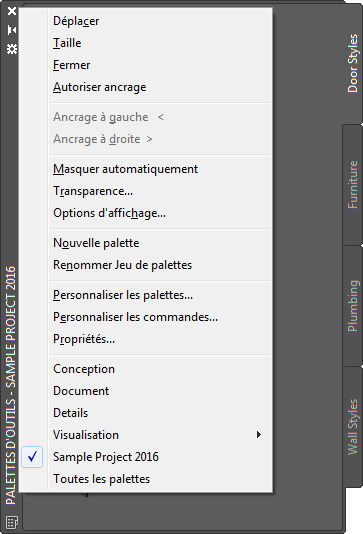 Le groupe de palettes d'outils du projet figure dans la liste des groupes de palettes disponibles et peut être sélectionné et affiché.