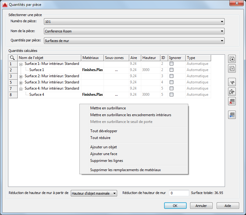 3. Pour chaque quantité par pièce calculée (surfaces de mur, de sol et de plafond), cliquez sur le bouton Parcourir pour afficher toutes les sous-zones associées :