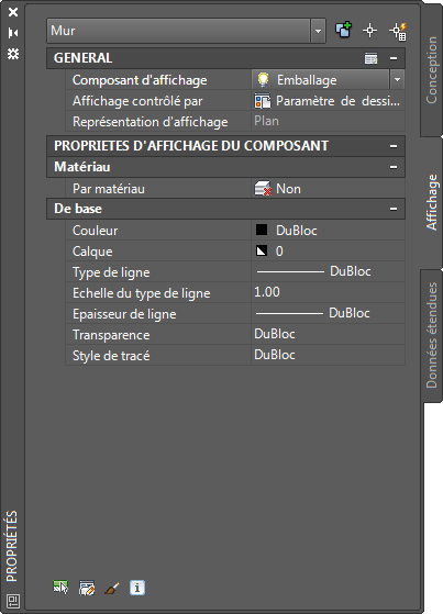 Comme l'onglet Conception de la palette des propriétés, l'onglet Affichage permet de définir les propriétés graphiques d'un objet en ajustant les paramètres de chacun de ses composants (par exemple, les contours et les hachures). Les modifications apportées dans cet onglet se reflètent immédiatement dans la représentation d'affichage active (par exemple, Plan ou Modèle). Vous avez également la possibilité d'appliquer ces modifications aux autres représentations d'affichage. De plus, contrairement aux paramètres de l'onglet Conception, qui s'appliquent uniquement aux objets sélectionnés, les propriétés définies dans l'onglet Affichage peuvent s'appliquer au composant sélectionné pour l'ensemble des objets de ce type ou de ce style, ou uniquement pour l'objet sélectionné. Si le composant d'affichage est contrôlé par un matériau, les modifications s'appliquent à tous les objets utilisant ce matériau.