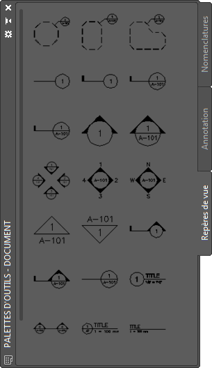 Les palettes personnalisées créées par votre gestionnaire CAO ou d'autres utilisateurs peuvent également contenir des outils de repères de vue avec des propriétés personnalisées en fonction de vos projets ou de vos normes d'entreprise.