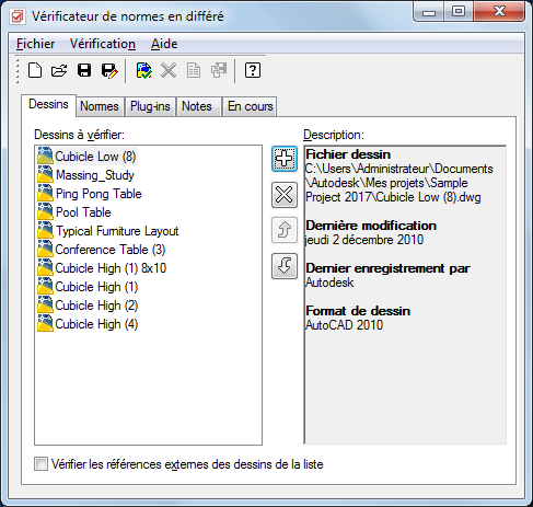 Avant de lancer le Vérificateur de normes en différé d'AutoCAD, n'oubliez pas de mettre à jour le fichier CHX du projet pour être sûr qu'il contient la liste des fichiers de normes AutoCAD et des fichiers de projet les plus récents.