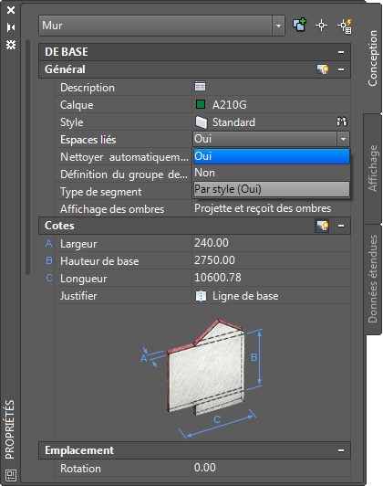 Remarque : La propriété Espaces liés ne s'affiche pas lors de l'ouverture du dessin dans un environnement AutoCAD Architecture Object Enabler comme AutoCAD, Civil 3D ou Land Desktop, ou lorsque vous exécutez AutoCAD Architecture en tant qu'application AutoCAD. Elle ne s'affiche que dans une installation complète d'AutoCAD Architecture ou d'AutoCAD MEP.