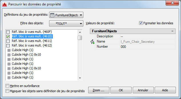 afficher la liste des objets ou styles auxquels un jeu de propriétés est associé | appliquez le filtre des objets au jeu de propriétés. Le volet de gauche répertorie les volets ou les styles auxquels le jeu de propriétés est associé. Si l'option Mettre en surbrillance est sélectionnée, tous les objets auxquels le jeu de propriétés est associé (directement ou par le biais d'un style) sont mis en surbrillance dans le dessin. |