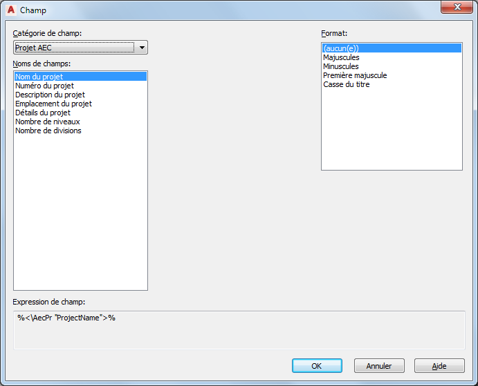 Vous pouvez créer une propriété manuelle sous forme de marque de réservation pour un champ. Dans ce cas, vous entrez le champ dans la propriété lorsque vous l'avez associée à un objet ou à un style. Si vous entrez un champ comme valeur par défaut pour une propriété manuelle dans une définition, tous les objets ou styles auxquels la propriété est attachée contiennent déjà le champ.