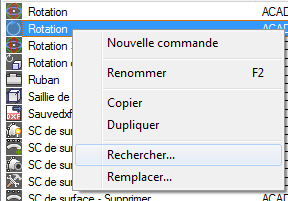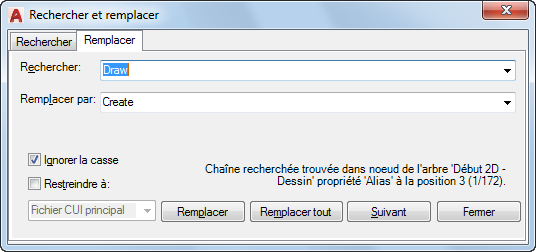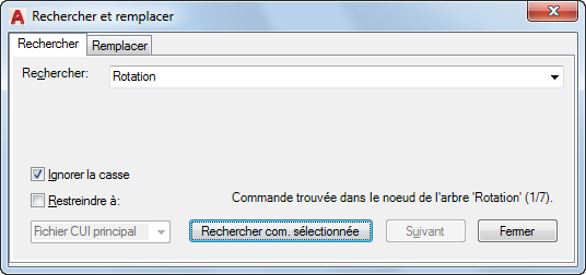 Un message s'affiche, détaillant l'emplacement de la commande, sa position exacte dans le volet Personnalisations dans ou Propriétés, ainsi que le nombre d'occurrences de la commande.