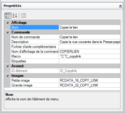 Le tilde (~) et le point d'exclamation suivis d'un point (!.) sont placés au début du libellé de la commande Copier le lien dans la propriété Nom du volet Propriétés. Ci-dessous, la commande Copier le lien apparaît maintenant marquée et en grisé dans le menu Edition.