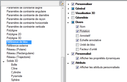 Contrôle de l'affichage des propriétés personnalisées et des attributs pour les références de bloc
