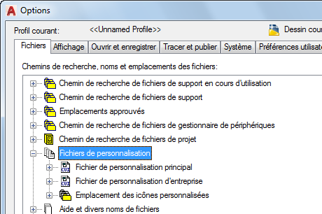 2. Dans l'onglet Fichiers de la boîte de dialogue Options, cliquez sur le signe Plus (+) en regard du noeud Fichiers de personnalisation pour le développer.