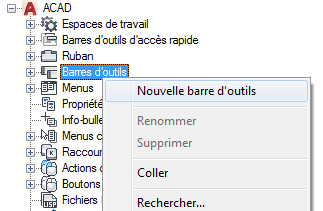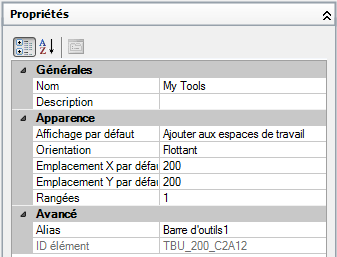 Remarque : Les modifications apportées ici aux propriétés d'une barre d'outils concernent uniquement l'apparence initiale de la barre d'outils après le chargement du fichier de personnalisation (CUIx). Il est recommandé d'utiliser un espace de travail pour contrôler l'apparence d'une barre d'outils.