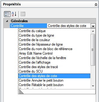 - Dans le volet Propriétés, dans la zone Contrôle, cliquez sur une flèche pour afficher la liste des contrôles de barre d'outils disponibles.