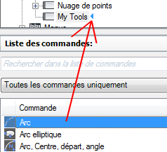 - Dans le volet Liste des commandes, faites glisser la commande que vous voulez ajouter jusqu'à la barre d'outils de votre choix dans le volet Personnalisations dans <nom de fichier>.