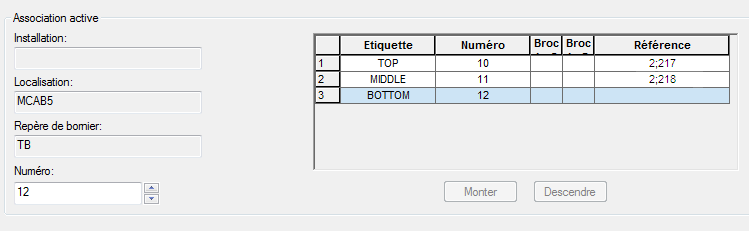 Remarque : La grille de droite est remplie avec la définition de la borne sélectionnée : Niveau 1 a Etiquette = HAUT, Numéro = 10, Référence = 2 217.