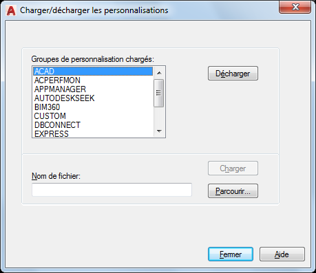 Spécifie le fichier à charger si vous cliquez sur Charger. Vous pouvez entrer le nom du fichier ou cliquer sur Parcourir pour afficher la boîte de dialogue Sélectionner un fichier de personnalisation (boîte de dialogue standard de sélection de fichiers).