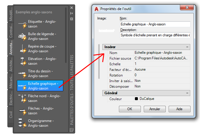 Une fois qu'un outil se trouve sur une palette, vous pouvez modifier ses propriétés. Par exemple, vous pouvez modifier l'échelle d'insertion d'un bloc ou l'angle d'un motif de hachures.