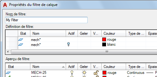 Par exemple, si vous souhaitez afficher la liste de tous les calques dont le nom contient les lettres mech, entrez *mech*.