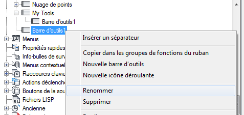 3. Cliquez avec le bouton droit de la souris sur la barre d'outils nommée Barre d'outils1, et non pas sur l'icône déroulante. Cliquez sur Renommer et entrez le nouveau nom.
