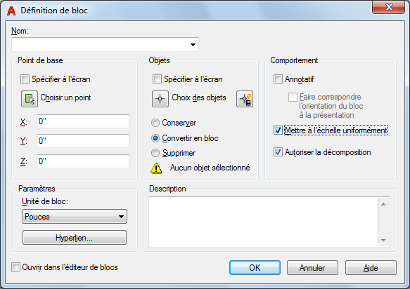 Ferme provisoirement la boîte de dialogue Définition de bloc tandis que vous sélectionnez les objets destinés au bloc. Une fois la sélection d'objets effectuée, appuyez sur Entrée pour retourner à la boîte de dialogue.