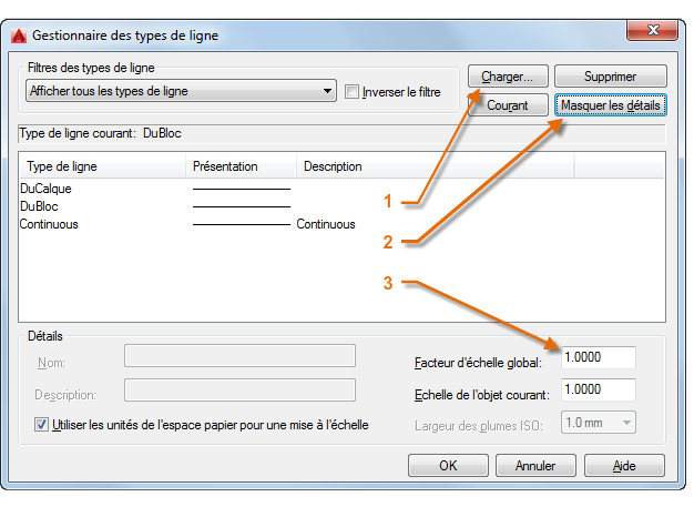 1. Cliquez sur Charger. Sélectionnez un ou plusieurs types de ligne que vous souhaitez utiliser. Notez que les types de ligne discontinus (non continus) sont disponibles dans plusieurs tailles prédéfinies.
