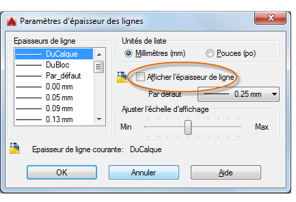 Pour contrôler l'affichage des épaisseurs de ligne, cliquez sur le bouton Paramètres d'épaisseur des lignes situé en bas de la liste des épaisseurs de ligne. Dans la boîte de dialogue Paramètres d'épaisseur des lignes, vous pouvez indiquer si vous souhaitez afficher ou masquer les épaisseurs de ligne.