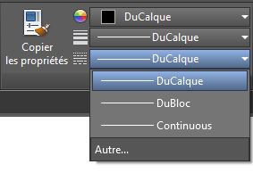 Une fois que vous avez chargé les types de ligne que vous souhaitez utiliser, vous pouvez sélectionner un objet et spécifier un type de ligne dans le groupe de fonctions Propriétés ou la palette Propriétés. Vous pouvez également spécifier un type de ligne par défaut pour un calque en utilisant le Gestionnaire des propriétés des calques.