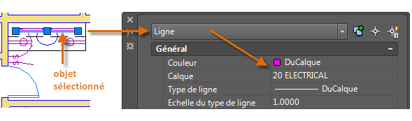 Une propriété définie sur "DuCalque" hérite des paramètres du calque. Dans l'exemple précédent, les objets créés sur le calque 20 ELECTRICAL apparaissent en violet, car il s'agit de la couleur par défaut des objets de ce calque.
