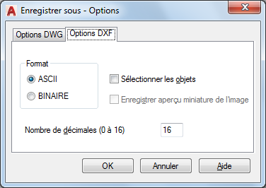 Indique si le programme crée un fichier ASCII ou un fichier DXF binaire. Les fichiers DXF au format ASCII peuvent être lus par un éditeur de texte et sont compatibles avec un plus grand nombre d'applications. Les fichiers DXF au format binaire sont plus compacts. Les opérations de lecture et écriture sur des fichiers au format binaire sont plus rapides que sur des fichiers au format ASCII.