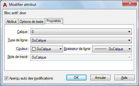Définit le calque sur lequel repose l'attribut, ainsi que la couleur, l'épaisseur et le type de ligne associés. Si le dessin utilise des styles de tracé, vous pouvez en associer un à l'attribut via l'onglet Propriétés.