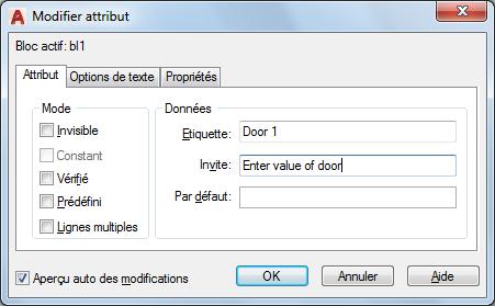 Active ou désactive la vérification des valeurs. Si cette option est sélectionnée, vous êtes invité à vérifier les valeurs associées à l'attribut lors de l'insertion d'une nouvelle occurrence du bloc. Dans le cas contraire, la vérification ne se fait pas.
