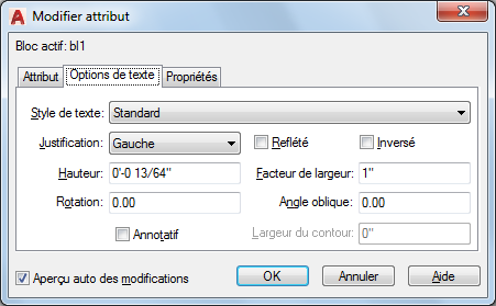 Détermine si la zone de dessin est immédiatement mise à jour pour afficher les changements d'attribut visible effectués. Si l'option Aperçu auto des modifications est sélectionnée, les changements sont visibles immédiatement. Dans le cas contraire, les changements ne sont pas visibles immédiatement.