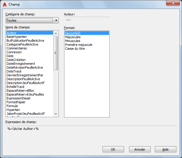 Le libellé de cette option varie selon le nom de champ. Ainsi, par exemple, si Nom de fichier est sélectionné dans la liste Noms de champs, le libellé est Nom de fichier et la valeur est le nom du fichier dessin courant. Les champs d'objet ont pour libellé Propriété. Exception : si un champ de date est sélectionné, le format de date sélectionné s'affiche (M/j/aaaa, par exemple).