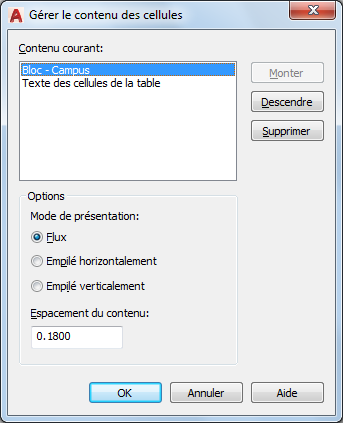 Répertorie tout le texte et tous les blocs contenus dans la cellule sélectionnée par ordre d'apparition. Le texte est signalé par l'étiquette Texte des cellules de la table. Les blocs sont signalés par la mention "Bloc" précédant le nom du bloc.