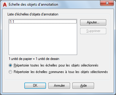 Indique que toutes les échelles prises en charge par les objets sélectionnés sont affichées dans la liste d'échelles d'objets d'annotation.