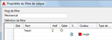 Affiche les propriétés des calques déterminant les calques répertoriés dans la liste. Vous pouvez spécifier une ou plusieurs propriétés pour définir le filtre. Toutes les propriétés spécifiées sur une seule ligne dans la définition de filtre doivent être définies sur True pour afficher le nom d'un calque (opérateur logique AND). Les lignes suivantes de la définition de filtre spécifient d'autres critères (opérateur logique OR).