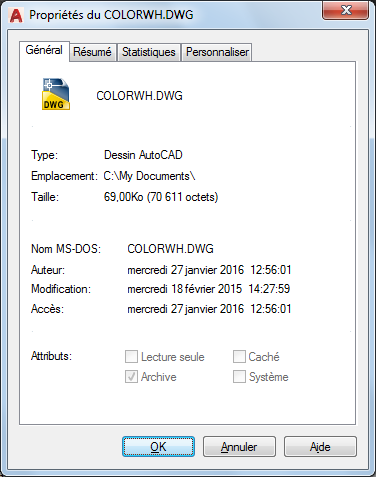 Affiche des informations en lecture seule fournies par le système d'exploitation concernant le fichier de dessin.