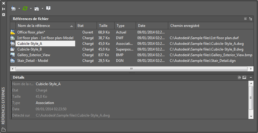 - Affiche une liste des références dans le dessin courant, y compris les informations telles que l'état, la taille et la date de création.