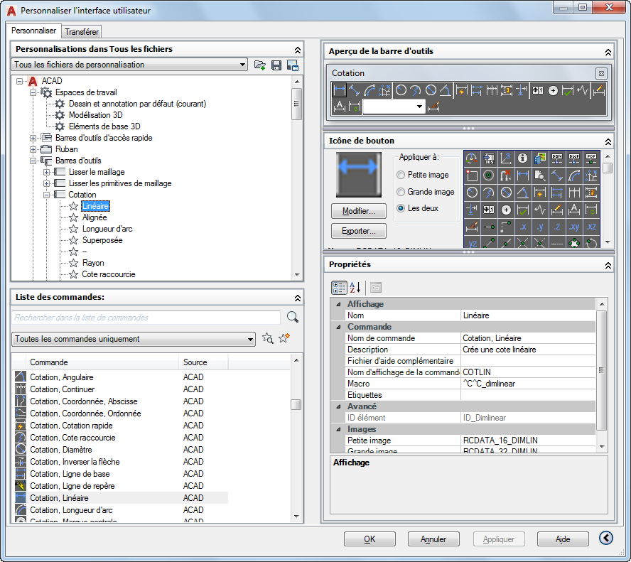 Fournit une interface de personnalisation des espaces de travail, barres d'outils, menus, groupes de fonctions du ruban, menus contextuels et autres éléments de l'interface utilisateur.