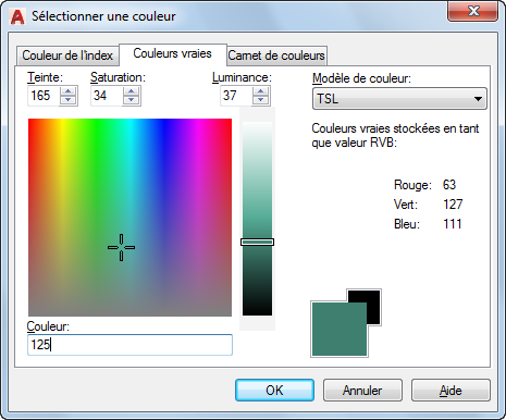 Spécifie le modèle de couleurs RVB pour la sélection des couleurs. Les options disponibles dans l'onglet Couleurs vraies dépendent du modèle de couleurs indiqué : TSL ou RVB.