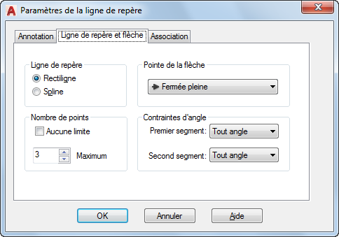 La boîte de dialogue Paramètres de la ligne de repère comporte les onglets suivants : Annotation, Ligne de repère et flèche, ainsi qu'Attachement.