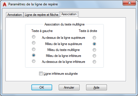 Définit l'emplacement d'attachement des lignes de repère et du texte multiligne d'annotation. Cet onglet est uniquement disponible si Textmult est sélectionné dans l'onglet Annotation.