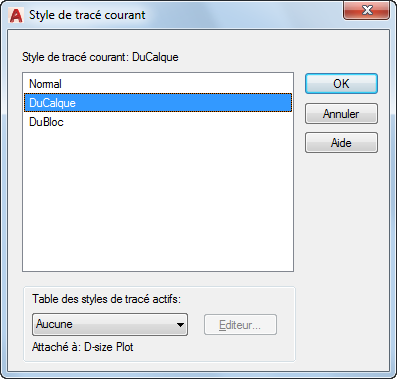 Affiche les styles de tracé disponibles pour un objet, y compris le style par défaut NORMAL. Un style de tracé est un ensemble de paramètres définissant la couleur, le panachage, l'échelle de gris, le tramage, le type de ligne, l'épaisseur de ligne, les styles d'extrémité, les styles de jointure et les styles de remplissage.