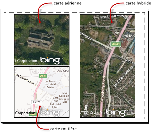 Vous pouvez afficher la carte sous la forme d'une image satellite (carte aérienne) ou d'une image vectorielle (carte routière). Vous pouvez également afficher la carte de manière hybride, alliant les styles aérien et routier. Si la zone de dessin est divisée en plusieurs fenêtres, chacune d'entre elles peut posséder un style de carte différent.
