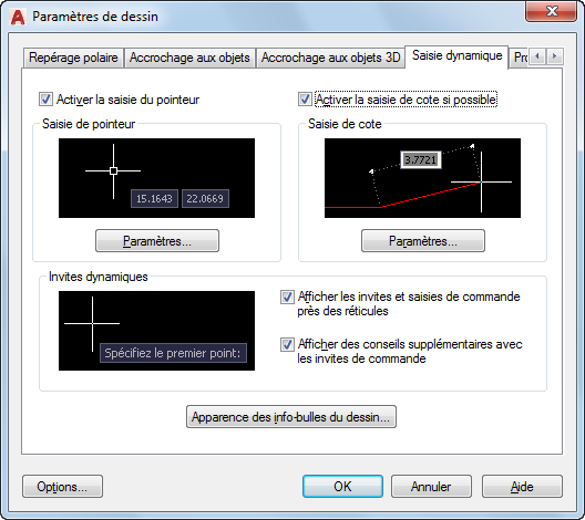 Gère la saisie du pointeur, la saisie de cote, les invites dynamiques et l'apparence des info-bulles de dessin.