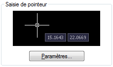 Lorsque la saisie du pointeur (curseur) est activée et qu'une commande est en cours d'exécution, l'emplacement des réticules s'affiche dans les zones de saisie (dans une info-bulle) à proximité du curseur. Vous pouvez entrer des coordonnées dans l'info-bulle plutôt que sur la ligne de commande.