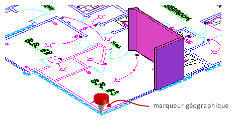 Les informations d'emplacement géographique d'un fichier de dessin sont basées sur une entité qualifiée de marqueur géographique. Le marqueur géographique désigne un point de référence de l'espace objet correspondant à un emplacement sur la surface de la Terre, dont la latitude et la longitude sont connues. Le programme enregistre également la direction du nord à cet emplacement. Sur la base de ces informations, le programme est en mesure de déterminer les coordonnées géographiques de tous les autres points du fichier de dessin.